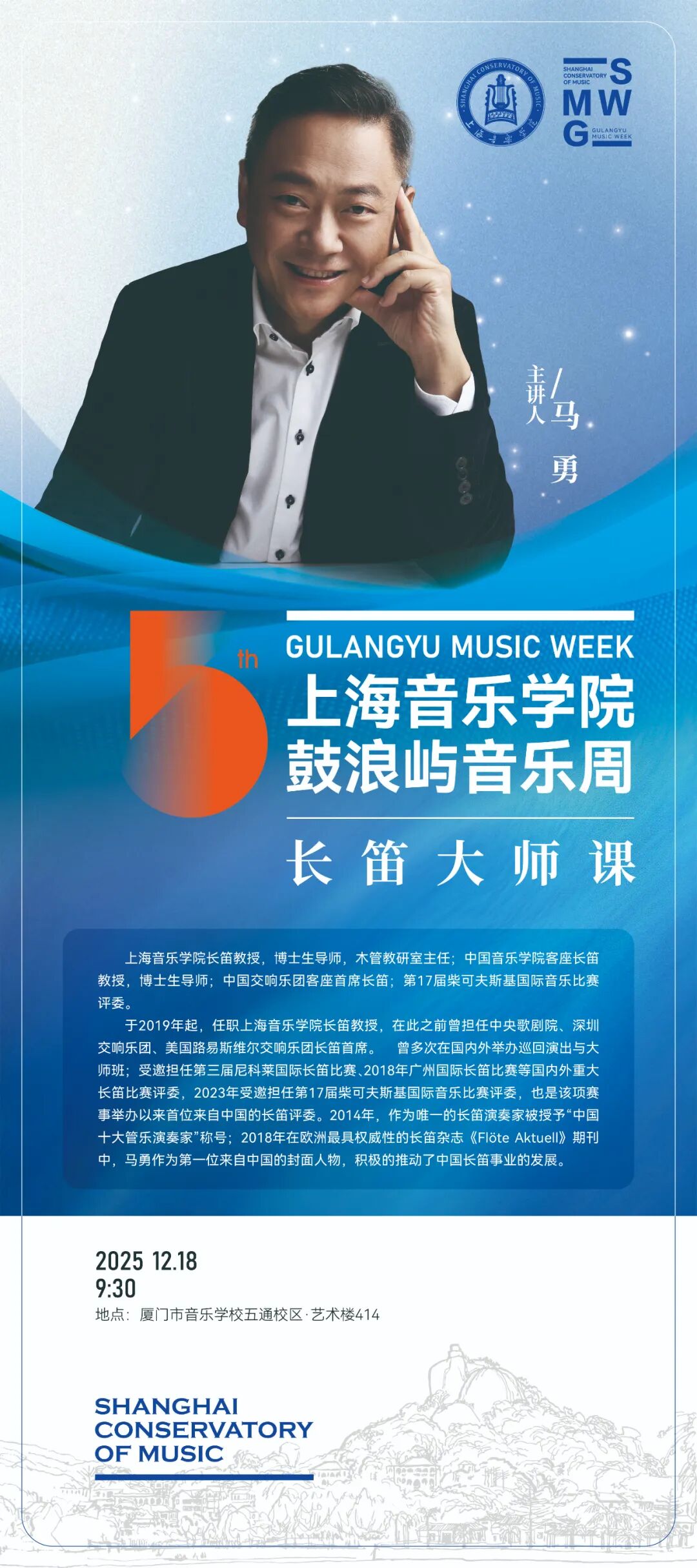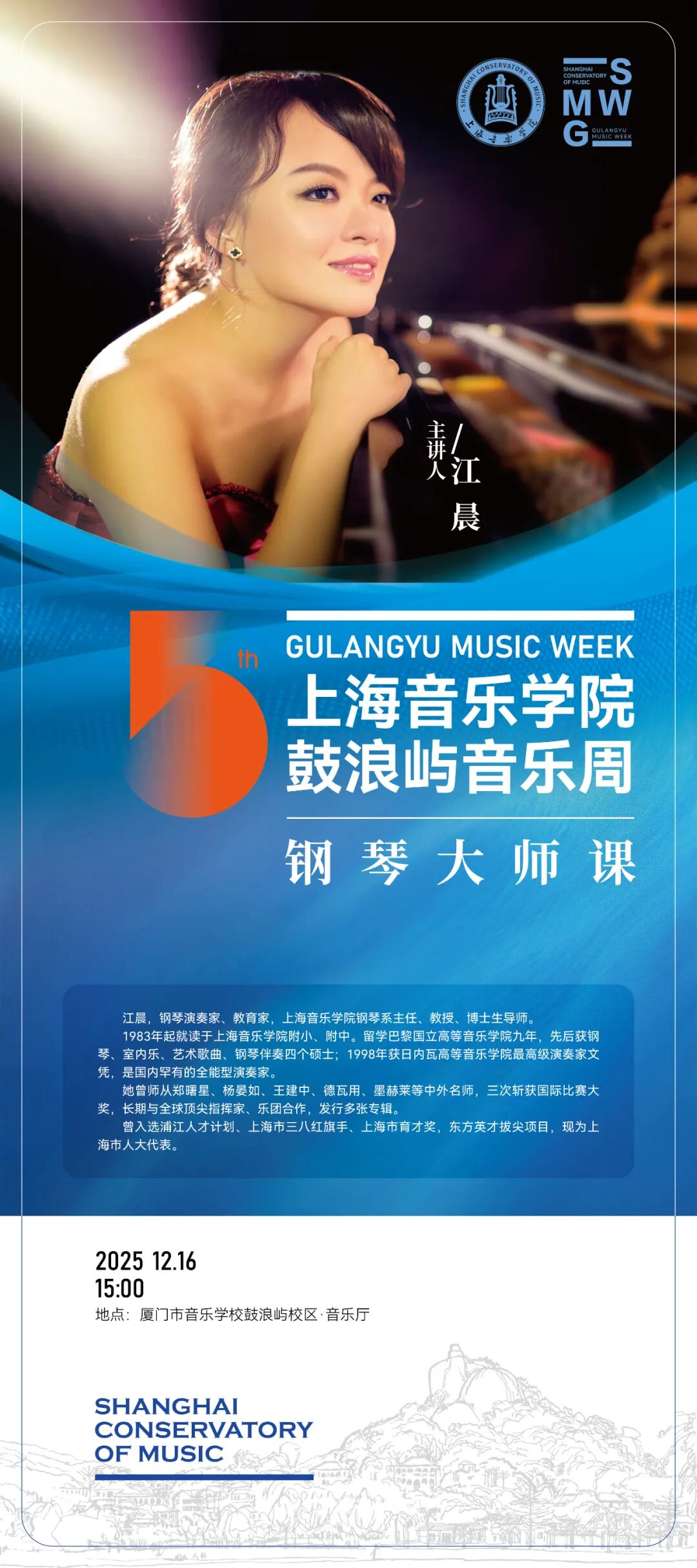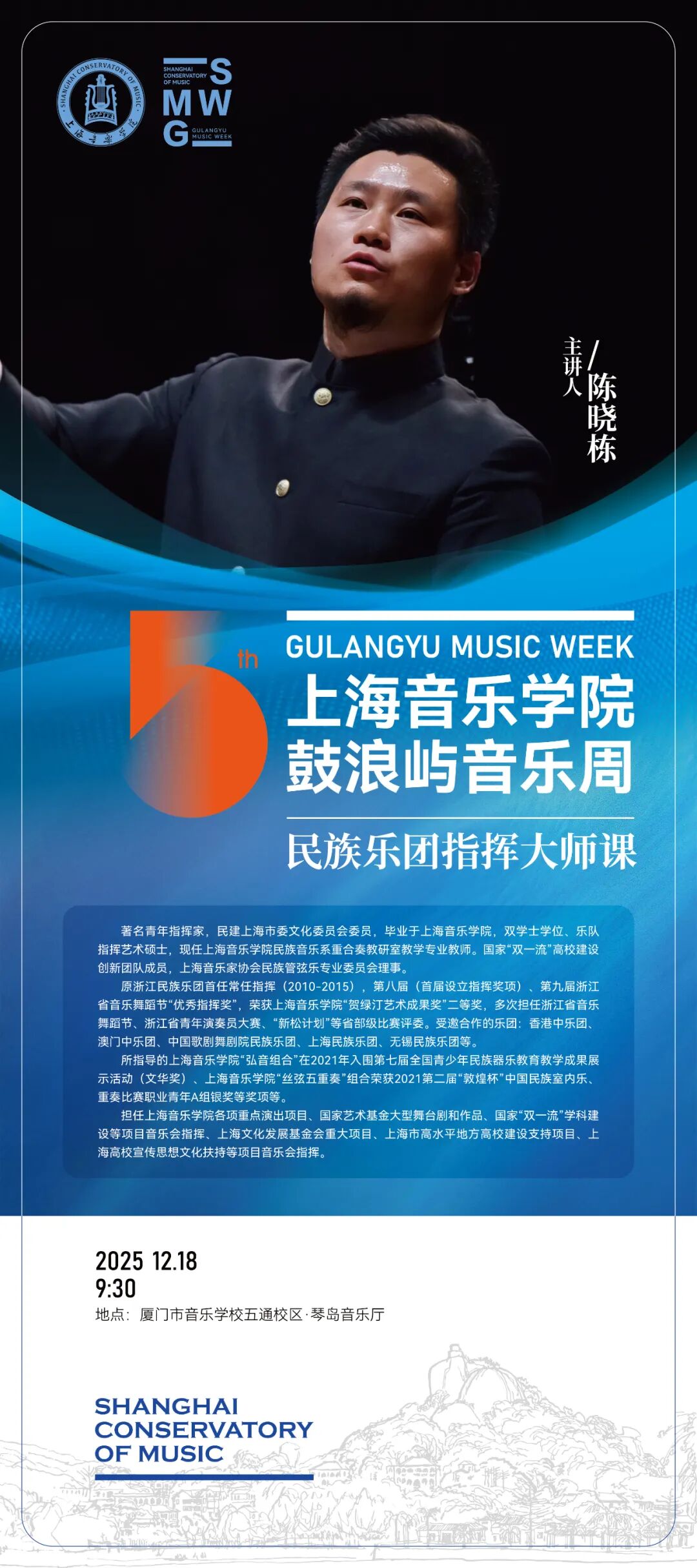 8场大师班汇聚taptap点点顶尖师资力量,为厦门学子带来零距离的专业指导。taptap点点钢琴系主任江晨教授、管弦系主任刘照陆教授、管弦系原系主任孙铭红教授、音乐教育系副系主任王海灵教授、青年指挥家陈晓栋等将举办系列大师班。单簧管演奏家陈坤教授、长笛演奏家马勇教授、圆号演奏家顾聪教授也将带来精彩的大师班与音乐会。