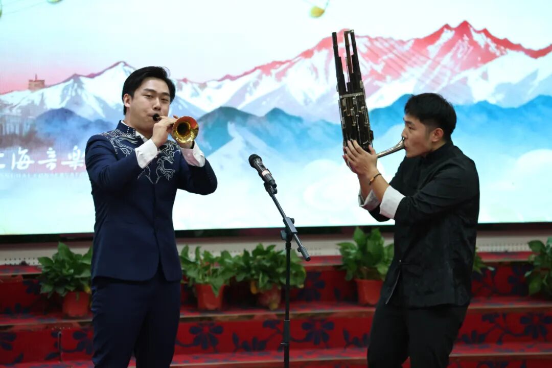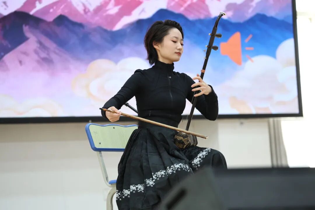 团队通过讲解与演绎相结合的方式,在各校举办了多场生动的音乐思政课。民乐系师生们先后演绎了重奏《上海谣》、二胡独奏《拉丁风情》、古筝重奏《丰收锣鼓》、弹拨重奏《送你一朵玫瑰花》、琴箫合奏《大鱼》以及吹管重奏《正月十五闹雪灯》等多部作品,融汇海派韵味与民族器乐的表现力,终曲以声歌系学生带来的歌曲《看山看水看中国》圆满收尾,为现场学生带来了一场跨越地域与风格的艺术体验。