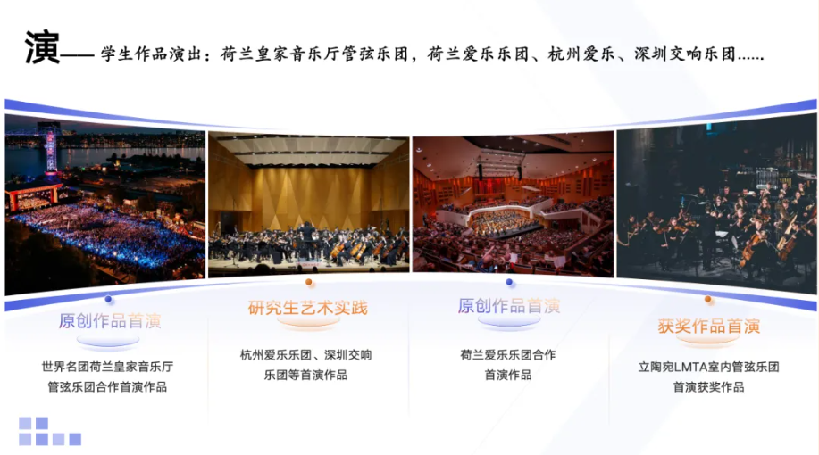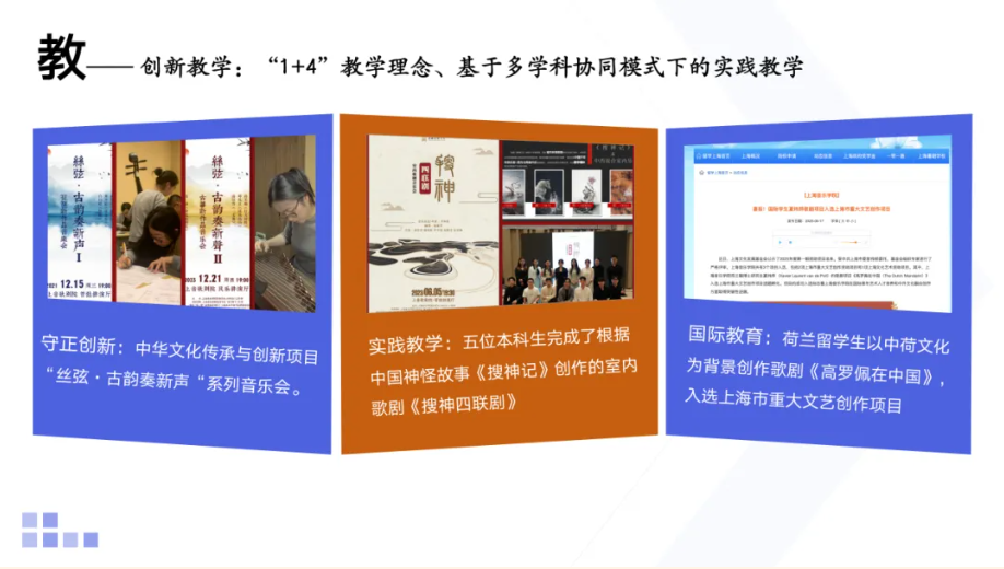 在教学实践中,我秉持“教创演研一体化”人才培养模式,以培养“德艺双馨、红专兼备、国际视野、全面发展的拔尖创新艺术人才”为己任。在创新教学方面,提出两个教学理念:一是以思政贯穿全程的“1+4”作曲教学理念(强化专业基础训练);二是多学科协同模式下的作曲实践教学(加强应用与社会服务)。学生们在“创、演、研”多个维度取得丰硕的成果。在国际学生教学中,鼓励荷兰留学生夏炜烨(Xavier VAN DE POLL)以中荷文化为背景创作歌剧《高罗佩在中国》,本项目入选上海市重大文艺创作孵化项目。正如中国驻荷兰大使馆在推荐信中强调,这是一项具有重要文化意义的跨国艺术实践。