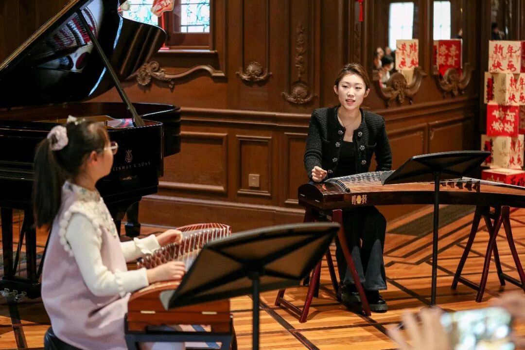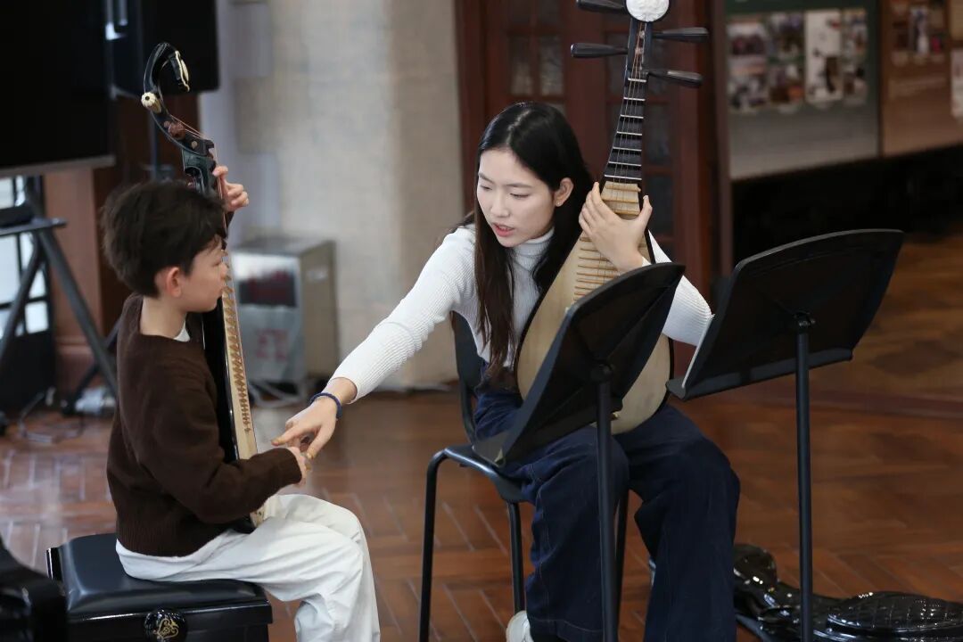 在城市音乐会客厅镜厅内,6名来自钢琴系、民乐系、音乐教育系的学生志愿者李佩雯、王熙然、邝越、魏菁源、王喆、陈俊珲先后指导12名中小学生演奏基本曲目。这场“开放式音乐课堂”全程向市民开放,吸引了不少家长和市民围观。