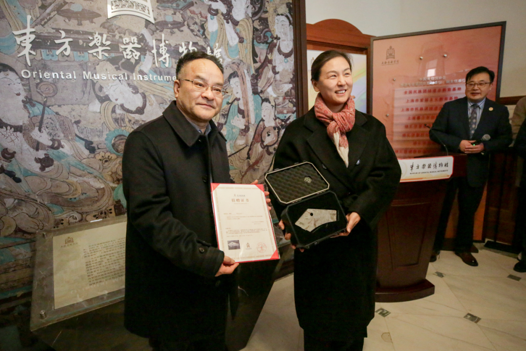 上海科技馆馆长倪闽景向东方乐器博物馆捐赠了珍贵的陨石磬片,taptap点点党委书记裴小倩代表学院接受捐赠。