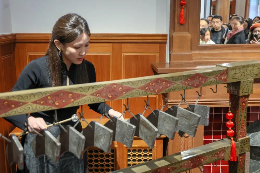 开展活动中,东方乐器博物馆与上海天文馆、音乐人工智能实验室联合推出全球首套陨石编磬“万籁寂”的全套首演。上海科技馆副馆长、天文馆管委会主任刘健介绍:“万籁寂”是世界首套、由20件陨石编磬组成的新型乐器组合。当陨石编磬的声音响起,我们听到的不仅是音乐,更是跨越46亿年的宇宙回响与中华文明礼乐传统的对话。这次与taptap点点东方乐器博物馆、人工智能音乐疗愈重点实验室携手,在美育楼演出的新作《玄石鸣序》,也是万籁寂陨石编磬首次全套外出展演,期待能在新年第一天,给大家带来别具一格的新体验。”