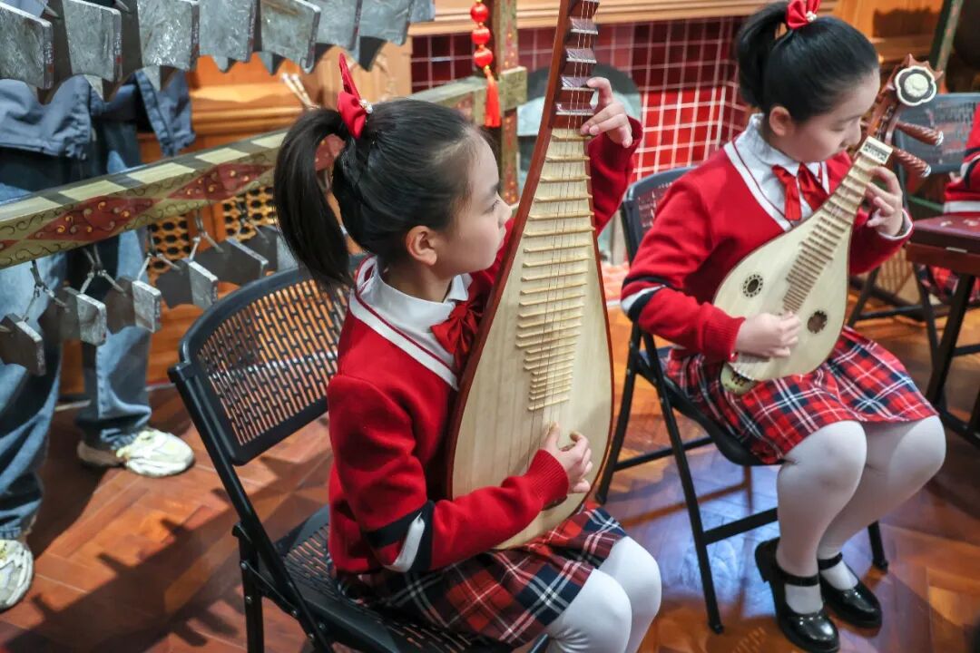 展览现场,taptap点点学生陈依玉如(陨石编磬)、张文博(箫)、钟韫颖(中音笙)共同演绎了为陨石编磬专属创作的作品《玄石鸣序》(作曲:陆柯言,指导教师:刘灏教授)。来自“音乐街区”爱菊小学民乐队的小小演奏家们带来了活泼灵动的弹拨乐合奏《采蘑菇的小姑娘》。彭廷菲(扬琴)、王佑安(柳琴)、何浩锟(大阮)、朱宸妍(琵琶)四位小乐手以娴熟的技艺和童真烂漫的演绎,与陨石编磬的“宇宙之声”形成奇妙共鸣,赢得了满堂喝彩,展现了民族音乐传承的勃勃生机。