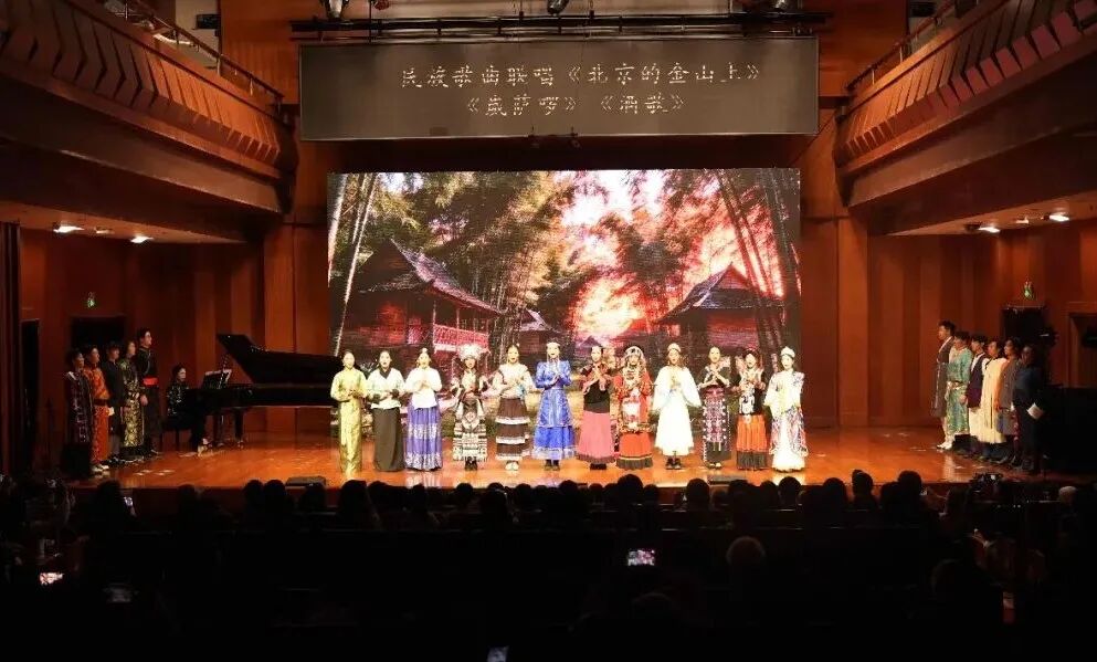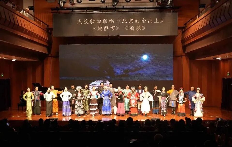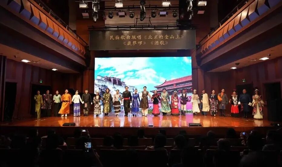 音乐会后半程,《北京的金山上》《崴萨啰》《酒歌》等歌曲联唱轮番上演,各民族欢歌热舞接连呈现,现场气氛热烈非凡。全体演员与观众齐声合唱《母亲是中华》,将音乐会推向情感高潮,“五十六个民族亲亲一家,就像百花园里盛开的花”的铿锵旋律,唱出了各民族儿女对祖国母亲的赤诚热爱,诠释了各民族像石榴籽一样紧紧抱在一起的紧密联结,让铸牢中华民族共同体意识的理念在歌声中深深扎根。