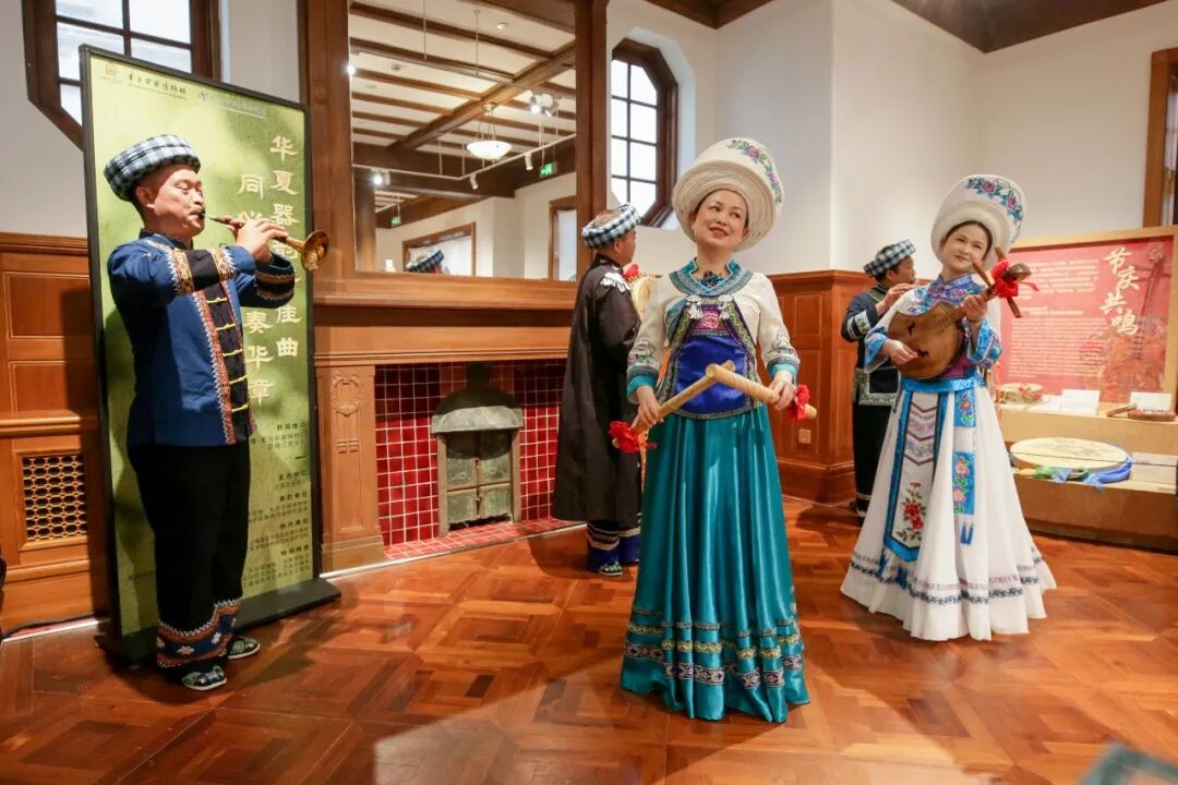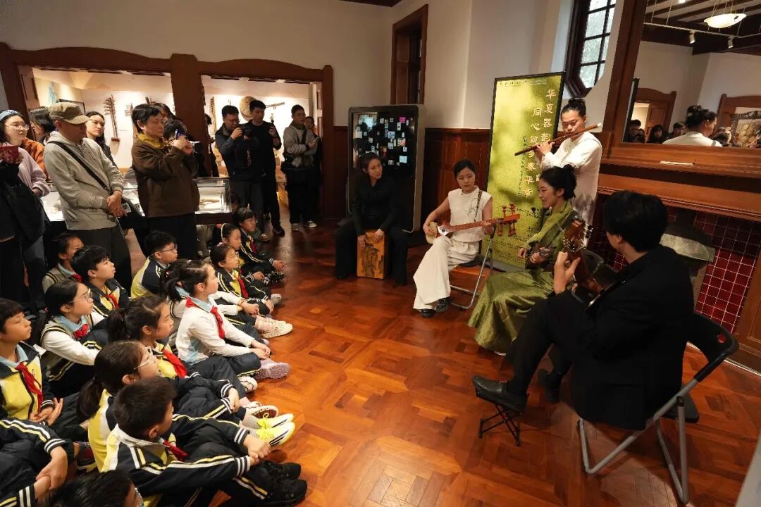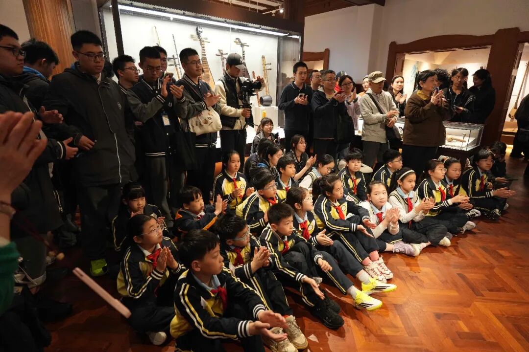 当天中午,尽管阴雨绵绵,本场演出也以“导赏+演奏”的形式,在taptap点点东方乐器博物馆火热开展。作为第 41 届上海之春国际音乐节taptap点点音乐开放周系列活动之一,本次沉浸式展演邀请了贵州黔西南州布依八音坐唱、西北果洛民族乐器弹唱、北方内蒙古呼麦等表演者齐聚一堂,为复旦附中徐汇分校、徐汇区第一中心小学的学生及众多上海市民,生动展现中华民族多元音乐文化的独特魅力。