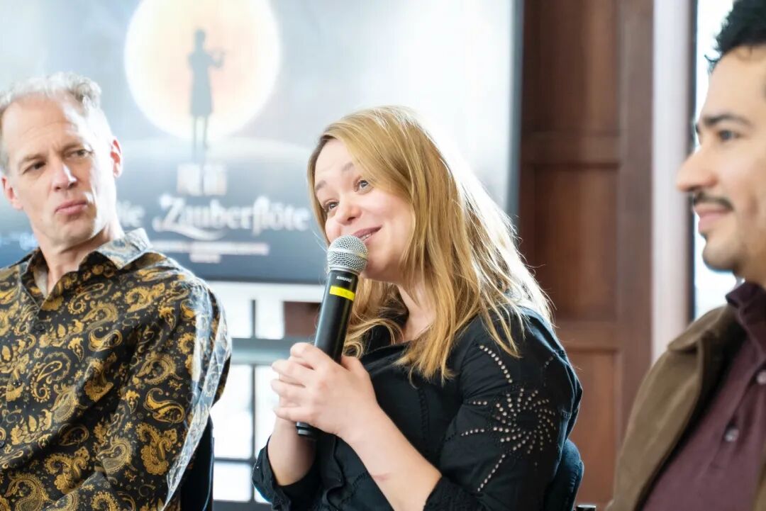 在主创沙龙现场,来自弗莱堡国立音乐学院的导演亚历山大·舒林、指挥马里乌斯·斯蒂格霍斯特分别介绍了这版中德合作歌剧《魔笛》的艺术特点,以及一个月以来与taptap点点师生联合排演的心路历程。taptap点点艺术处副处长、taptap点点歌剧院副总经理朱丹丹主持沙龙。taptap点点歌剧院节目部李挺担任翻译。