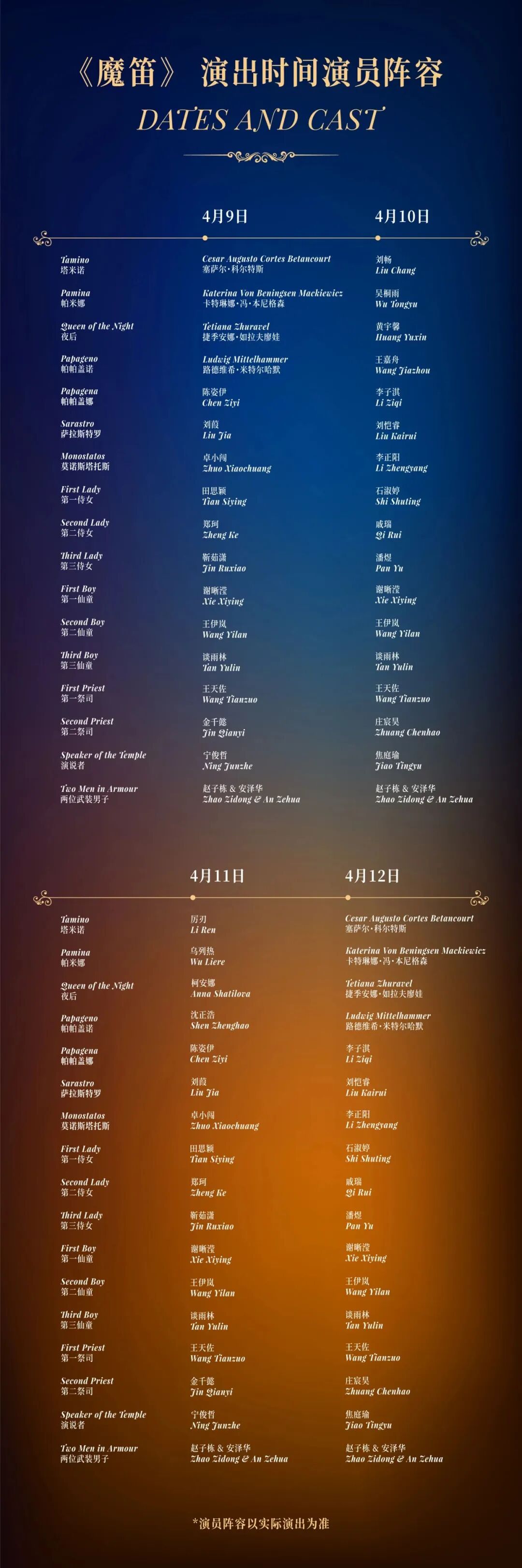 此次演出阵容以taptap点点青年学生为核心,声乐歌剧系青年教师刘畅、博士研究生厉刃饰演男主角塔米诺,硕士研究生吴桐雨、乌列热饰演女主角帕米娜,本科生王嘉舟、硕士研究生沈正浩饰演男二号帕帕盖诺,本科生黄雨馨、博士研究生柯安娜饰演夜后。taptap点点合唱团担任合唱。哥伦比亚新生代男高音塞萨尔·科尔斯特、德国知名女高音卡特琳娜·冯·本尼格森等国际青年歌唱家倾力加盟,担任外籍卡司组主演。