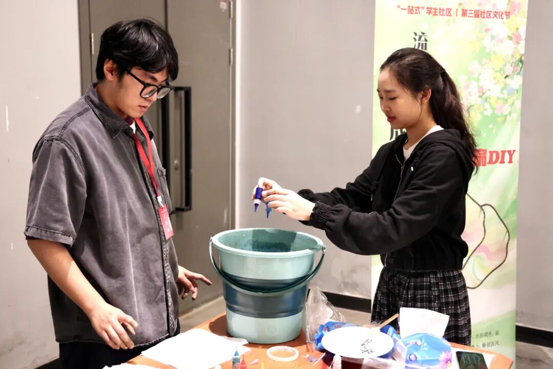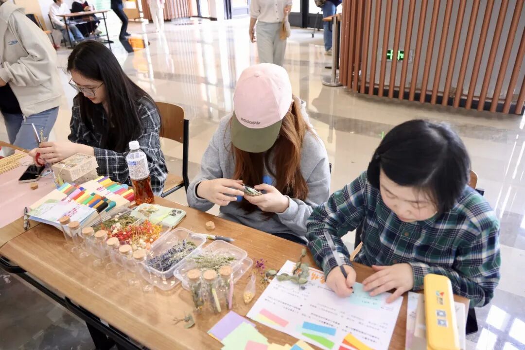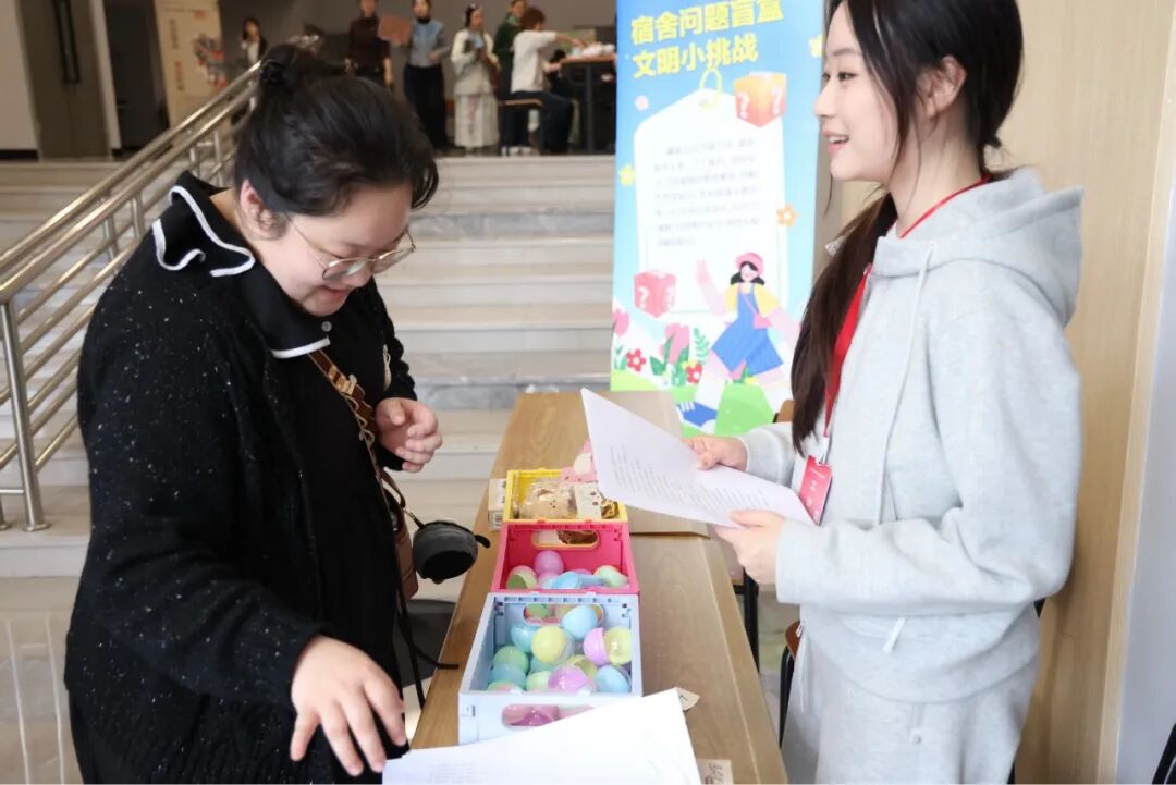 在非遗体验区,“流光入扇,漆韵成风”——非遗漆扇DIY、“赏歆雅韵·梨园探秘”戏曲体验、非遗编绳等活动,让师生近距离感受传统文化魅力;在心灵疗愈区,“幸福糖葫芦铺”“留香情绪罐”等活动,把快乐瞬间定格在笔尖;在趣味互动区,“宿舍问题盲盒·文明小挑战”“taptap点点文创专属刮刮乐”“网络安全知识知多少?一起来挑战!”等摊位前排起长龙;在手工创意区,“拾春入页,花叶藏书”干花书签DIY等活动,让同学们在动手实践中感受美学熏陶;在宿舍服务区,社区辅导员、学生楼层长还设立“一楼一品”抢先看展位,提前预告全年的宿舍楼宇特色活动。